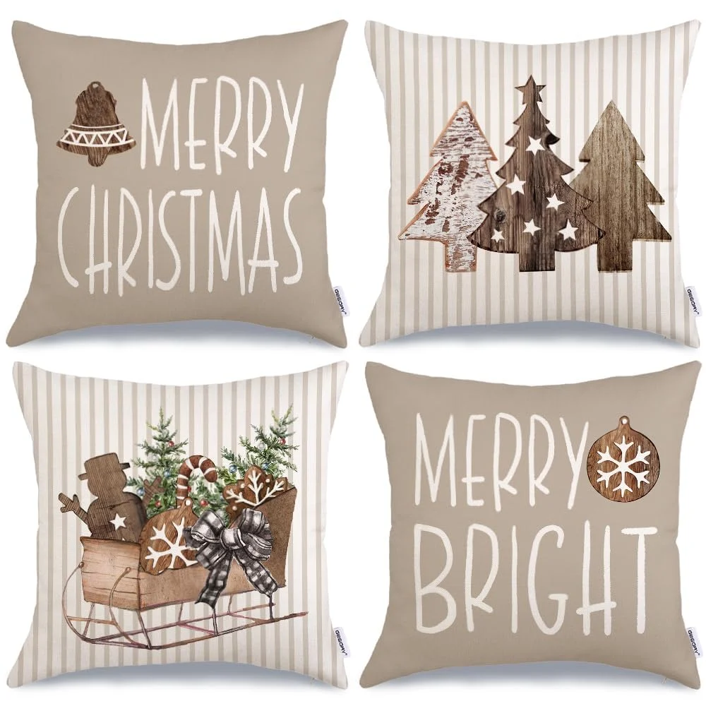 Brown Striped Christmas Throw Pillow Covers Set of 4 18x18 Inch Sleigh