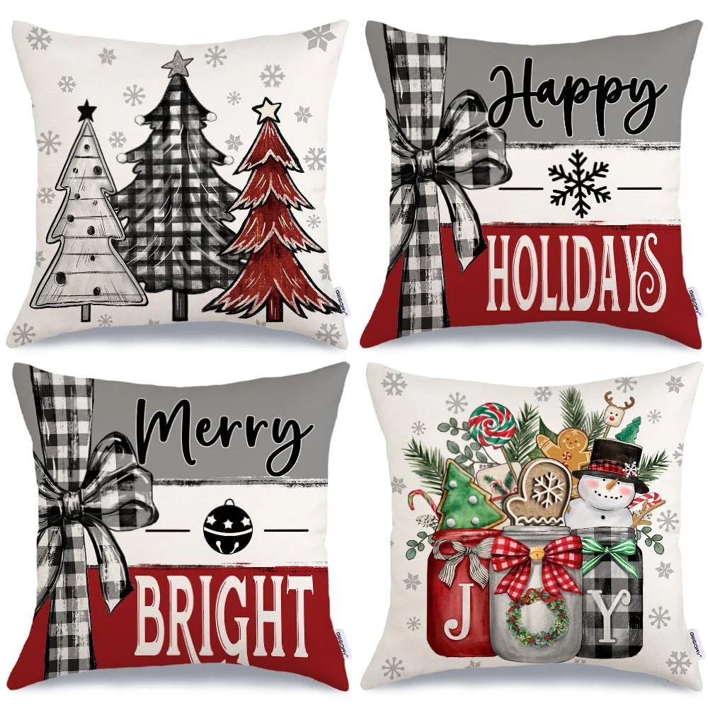 This set includes 4 decorative pillow covers featuring a variety of festive designs, using a primary color palette of Red, White, Black, and Gray — easy to match with any interior and perfect for adding a cheerful holiday accent.